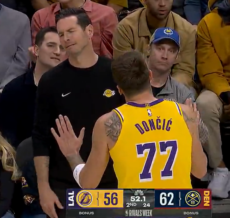次节东契奇跟裁判抱怨之前湖人只落后6分,但因为东契奇这个抱怨吃了一个T,大家可以看到雷迪克的表情多么的不理解、多么的绝望,东契奇的抱怨让掘金连续轻松反击拉开到14分!东契奇上半场拿到23分6篮板3助攻1抢断,个人发挥依旧强势但跟裁判纠缠不休+不退防让湖人陷入困境。