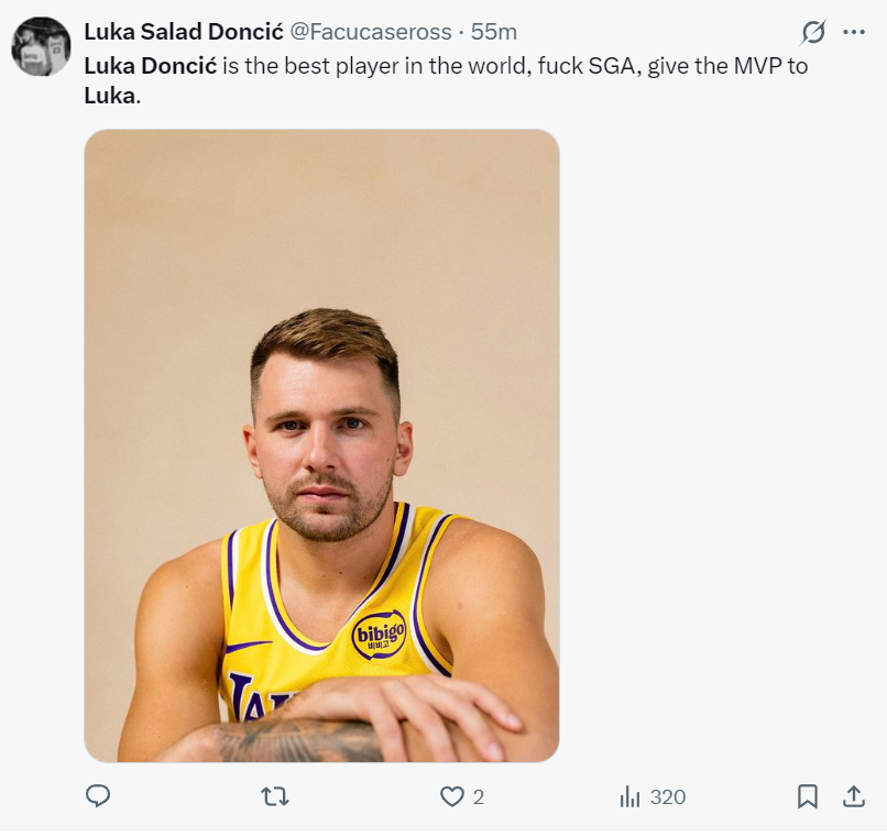 湖人球迷:东契奇才是全世界最强球员,FxxK亚历山大,将MVP给东契奇!
